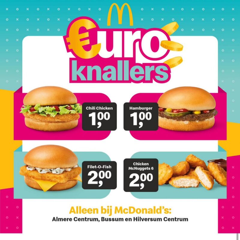 Een pilot van McDonald’s: in drie vestigingen maken de Euroknallers een comeback. Het gaat om de restaurants in Almere Centrum, Bussum en Hilversum Centrum. Daar zijn de hele maand oktobers
