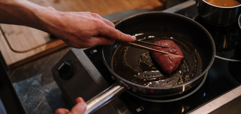 - Verwarm twee eetlepels olie in een koeken- of gietijzeren pan. Als de olie heel heet is voeg dan de steak toe. Bak op middel-hoog vuur de ribeye voor zo’n 2-3 minuten terwijl je hem constant in beweging houdt. Voeg dan 50 gram boter toe en bak nogmaals voor zo’n 2-3 minuten. bedruip de laatste minuut de steak met boter door de pan een beetje schuin te houden. Haal de steak uit de pan, kruid met versgemalen peper en zout en laat de ribeye voor vijf minuten rusten op de snijplank. Verwijder ondertussen de zaadjes van de granaatappel.