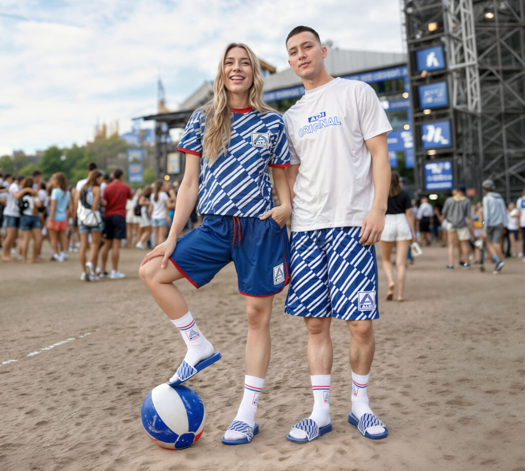Vanaf komende zaterdag 6 juli ligt de nieuwe ‘fanwear’-collectie van de Duitse supermarktketen in de eigen winkels. De collectie bestaat uit kleren en accessoires met het iconische ALDI-logo en een stijlvol blauwwit lijnenspel erop. Zo zijn er onder meer: sportsokken, t-shirts, slippers en sweatshorts.