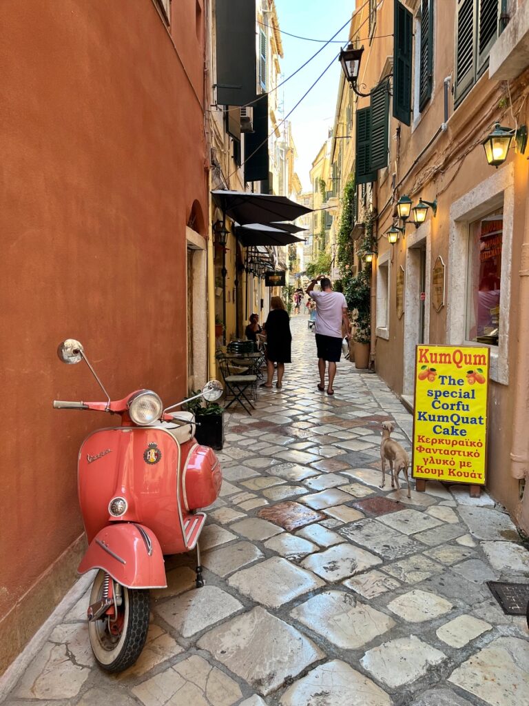 De eerste observatie op Korfoe was vooral: dit voelt to-taal niet als Griekenland. Het was hoogseizoen en overal waar je keek liepen toeristen. Zeg maar het minst fraaie als je op een drukke dag in Amsterdam door het centrum rondbanjert. Daarom tip van flip: pak wat zijstraten, ga een keertje extra links een straat in en zoek een pleintje op waar je wat locals ziet zitten.
