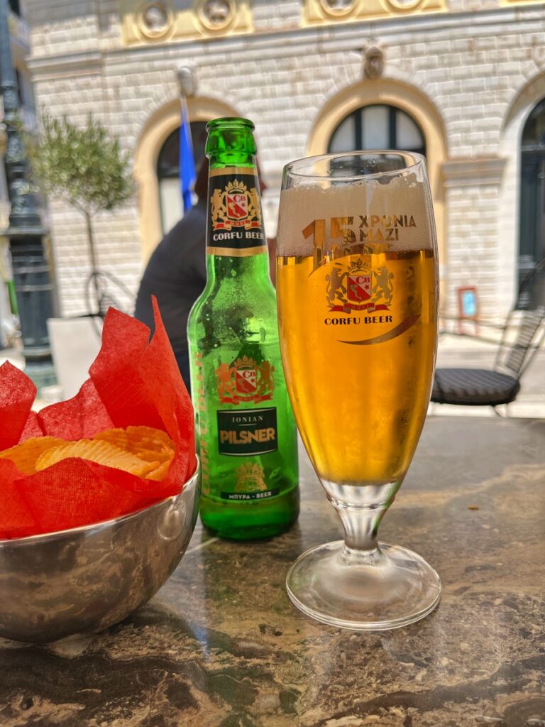 Toen ik een oudere vrouw zag bakkeleien in het Grieks met een wat jonger ogend persoon wist ik dat ik een topterras had gevonden. De serveerder reageerde heel soepel op wat vragen over de drukte en toeristen en begon daarna met wat lokale specialiteiten op het gebied van borrelhapjes en lokale bieren zoals een Alfa (!) biertje.