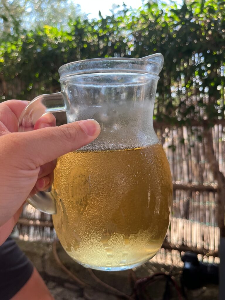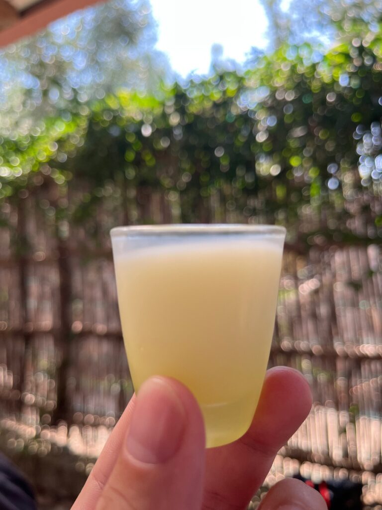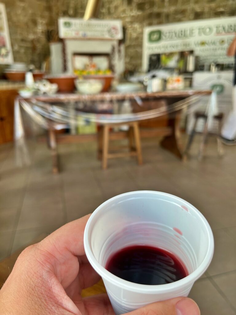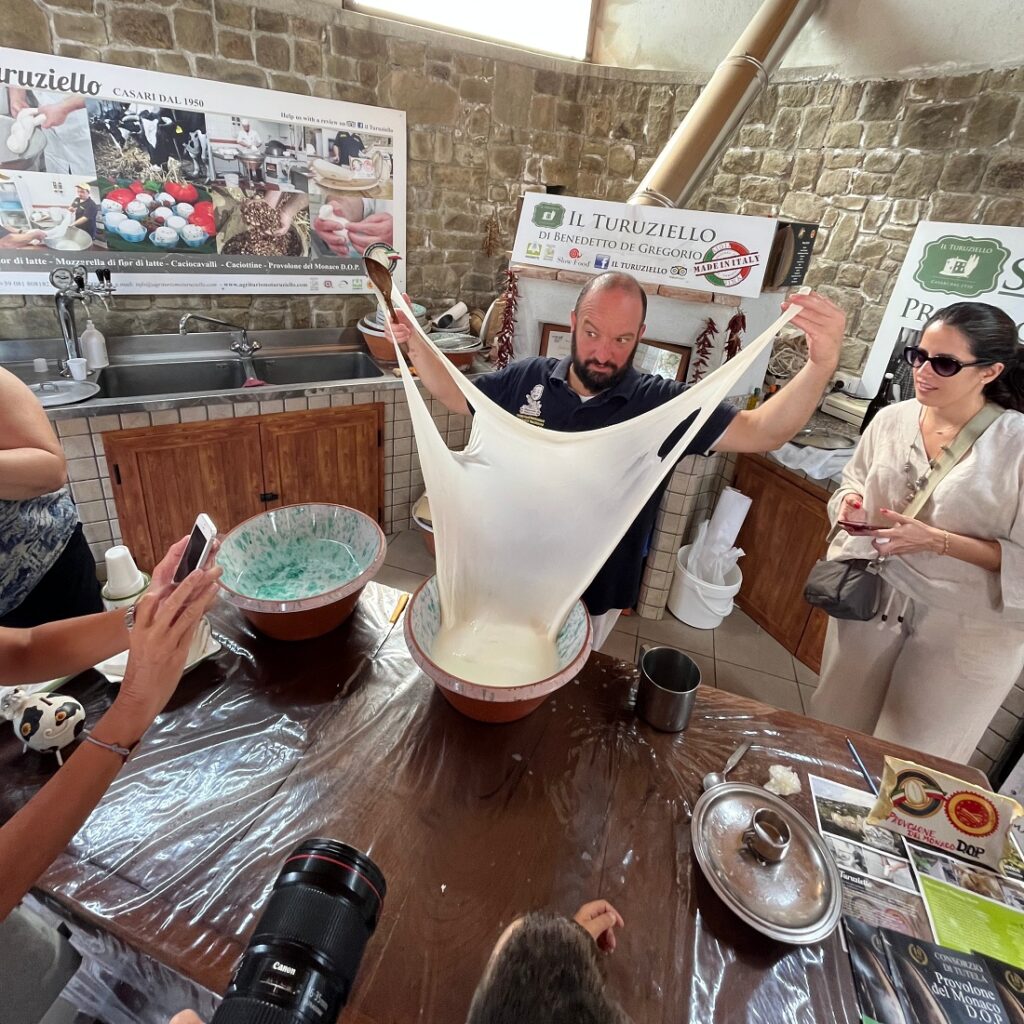 Daarna begon Benedetto met het maken van de meest verse mozzarella ooit, waarna we ook nog wat ricotta en caciotta kregen. Even voor het beeld: we schrijven een uurtje of 9 in de ochtend met een prachtig uitzicht op de Amalfikust. We krijgen allemaal een plastic bekertje aangereikt, de meesten denken heel enthousiast: Oh, een lekker sapje. Nou, het bleek dus gewoon een beker met rode wijn te zijn. Breakfast of champions!